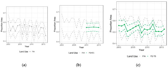 Before considering estimates of net or transitional change, it is instructive to look at the challenges in estimating LULC proportions across the landscape in any given year using FIA data as the response variable, either alone or assisted by auxiliary information. First, Figure 4a illustrates the annual estimates of the proportion of land area under forest land use, by year, using FIA data alone in a Horvitz–Thompson estimator. The large confidence intervals, along with the variability between annual samples collected in any one sub-panel (e.g., one-fifth of the FIA plots collected each year), make it difficult to decipher any meaningful trend in forest land use. Bringing in ICE data (collected on all the FIA plots in two- to three-year intervals) as phase 1 in a two-phase estimator reduces the size of the annual confidence intervals and, at first glance, suggests a smoothing effect on the inter-annual variability (Figure 4b). However, the 2010 and 2015 estimates were constructed from the exact same panels of FIA data, and the 2013 annual estimate just happened to lie close to the 2010/2015 estimates. Figure 4c, illustrating the effects of using TimeSync data as phase one in a two-phase estimator, gives a more complete story of the limitations of this two-phase approach. Again, we see a substantial reduction in the size of the confidence intervals, but this does not alleviate the year-to-year variability caused by using a different subset of plots for each year. The finding here is that using the annual FIA data themselves as a response does not provide meaningful estimates of status through time, even when aided with the ICE or TimeSync data through two-phase estimators.