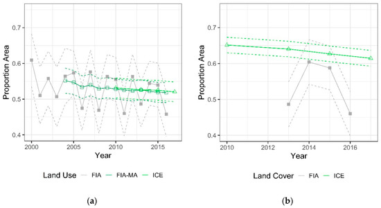 As already noted in our agreement analyses above, FIA and ICE land cover are only moderately related (Table 1). FIA data are not informative for tree land cover in this example because data only began being collected in 2013 so we cannot construct a meaningful five-year moving average. ICE (in light green triangles, Figure 5b), however, suggests a slowly decreasing trend.