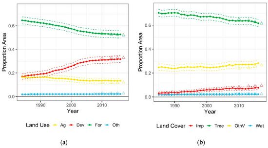 (a) The estimated proportion of land area in forest (green), agriculture (yellow), developed (red), and other (blue) land use, with 95% confidence intervals, by year, using TimeSync observations. (b) The estimated proportion of land area in tree (green), other vegetation (yellow), barren and impervious (red), and water (blue) land cover, with 95% confidence intervals, by year, using TimeSync observations. ICE estimates are superimposed on both graphs as open triangles.