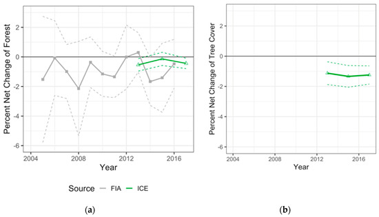 Estimates of percent net change (a) in forest land use and (b) in tree cover with 95% confidence intervals from FIA data (gray closed squares) at five-year intervals and ICE (green open triangles) at 2–3 year intervals.