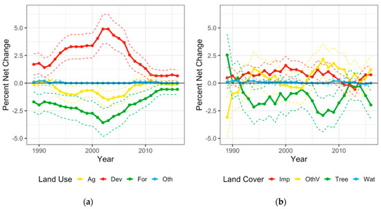 As might be expected, net change in land cover was more variable because use is an inherently more stable attribute. Figure 8b shows net land cover change over a five-year interval, revealing a significant but irregular loss in tree cover and a gain in impervious vegetation over time. Other vegetation is a difficult trend to decipher because it contains both agricultural and urban/suburban vegetation types. Of interest is the significant loss in tree cover late in the time series despite the apparent stability of forest land use (Figure 8a) for the same years, likely due to harvesting. It is interesting to note that the trends in land cover loss and gain are noticeably different when the change interval is increased from 5 to 10 years.