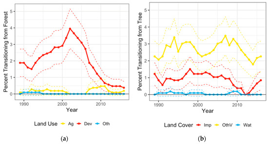 Transitional change from (a) forest land use and (b) tree land cover with 95% confidence intervals at five-year intervals from TimeSync observations.