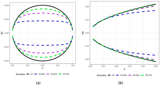 (a) Proportions (p) of change on the landscape and the expected standard errors using a Horvitz–Thompson estimator (black solid line) versus those using a post-stratified estimator, with change/no-change strata at varying map accuracies. Errors of omission in a no-change stratum are fixed at 95%. Accuracies within the change stratum are fixed at 95% (blue), 85% (green), and 75% (purple). (b) The same as (a) but zoomed in on small proportions.