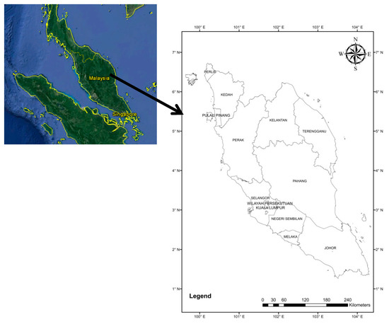 Malaysia is a tropical maritime country located in Southeast Asia and consists of Peninsular Malaysia, Sabah, and Sarawak. It experiences a humid tropical climate with average monthly temperatures ranging between 24 °C and 30 °C [36]. The size of Peninsular Malaysia is 132,090 [37] and consists of 11 states, as shown in Figure 1. Mineral and peat soil cover in Peninsular Malaysia is suitable for oil palm plantation. The species of oil palm planted in Malaysia is mostly from the Elaeis guineensis Jacq. species [38]. The states of Perlis, Kedah, Penang, Perak, and Selangor (Figure 1) receive a rainfall amount between 250 mm to 400 mm per month while other states in the east coast and south of the peninsular have recorded an average rainfall ranging from 100 mm to 150 mm. This climatological factor favors the growth of oil palm trees in Malaysia.