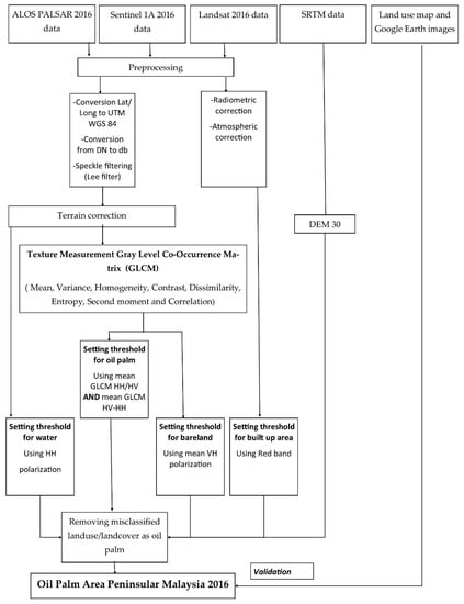 The main data used in this study was 22 scenes of radar images (ALOS PALSAR 2) dated 2016. ALOS PALSAR 2 was used to detect oil palm trees and water bodies. These data with 25 m spatial resolution (JAXA MOSAIC backscattering datasets) were obtained from the Japan Aerospace Exploration Agency (JAXA) [39]. Landsat-8 images dated 2016 were also used and the 30 m spatial resolution data were downloaded from the USGS Global Visualization Viewer (GloVis) website in order to remove built up areas by using the red band [40]. About 13 Landsat scenes with <20% cloud cover were downloaded. Sentinel level 1A (2016) ground range detected (GRD) products were also obtained from the European Space Agency (ESA) [41] in order to classify bare land in the study regions. This product was projected into WGS84. The digital elevation model (DEM) from the shuttle radar topography mission (SRTM) [42] (Derek Watkins, 2016) satellite was used to detect and remove any oil palm plantation found at higher altitudes of >1000 m. A land use map produced by the Department of Agriculture, Peninsular Malaysia, dated 2015 and Google Earth images dated 2016, were used to visually assess the oil palm areas detected in the study. Furthermore, comparison of the results obtained in this study was also compared with the oil palm area statistics obtained from the Malaysian Palm Oil Board (MPOB) for 2016 [3]. The datasets and overall methods adopted to map oil palm plantations in Peninsular Malaysia are shown in Table 1 and Figure 2, respectively.