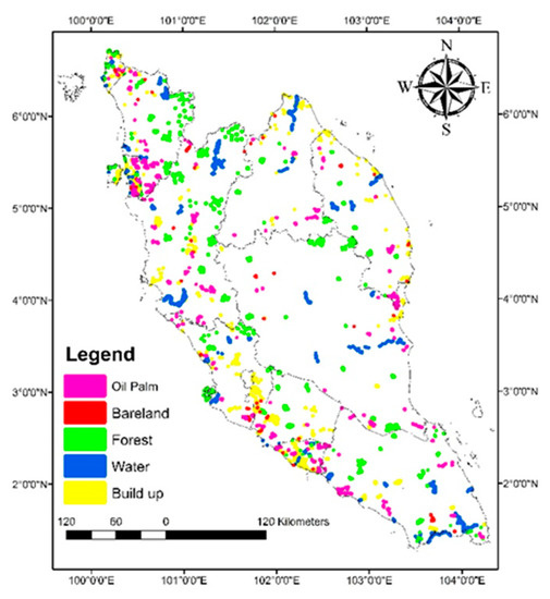 Maps showing the spatial and temporal (through multi temporal data analysis) distribution of oil palm plantation and other land use changes can assist in identifying illegal land conversion, such as if forests were converted into oil palm plantations. This is the practice adopted by the Roundtable Sustainability of Palm Oil (RSPO), a non-governmental organization that utilizes remote sensing data to map various land use and land cover changes to trace any intrusion of oil palm plantation into forest or other HCV areas such as peat land, and local people’s land. This practice is vital to ensuring the sustainable development of the oil palm industry to prioritize conservation and protection of natural resources and biodiversity [76]. A global analysis considering 20 countries reveals that oil palm cultivation is associated with deforestation [73]. In Southeast Asia, they reported almost 50% of the sampled plantations were originally forest in 1989. A similar trend was also noticed in South America (31%), Mesoamerica (2%), and Africa (7%). In Kalimantan, approximately 90% of the forested areas were replaced by oil palm and mapping these areas has helped identify non-deforested locations that can be protected from further conversion [77]. Another HCV area often considered for planting oil palm is peat land, which contributes significantly to the emission of GHGs to the atmosphere when disturbed [74]. Mapping and demarcating the boundaries of oil palm plantations can aid in detecting any unauthorized invasion to these lands. A previous study [78] discovered approximately half of the peat land in Sarawak had been transformed into oil palms. A regular monitoring, mapping, and reporting of the oil palm plantations in this region will enable timely actions to be taken to protect remaining peat lands.