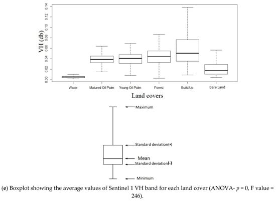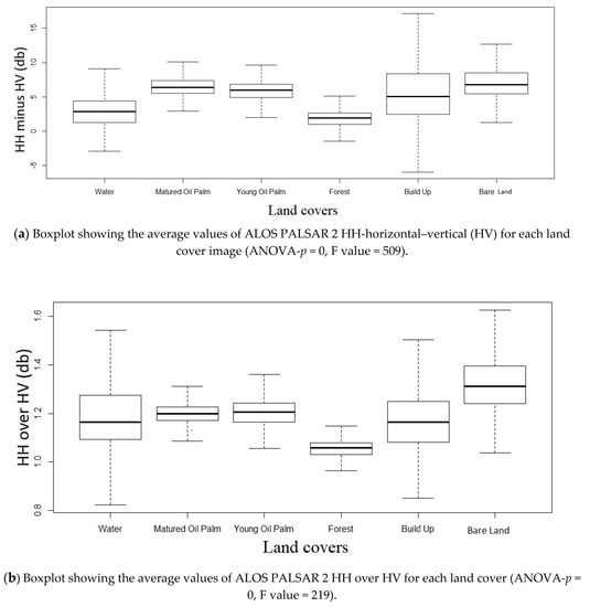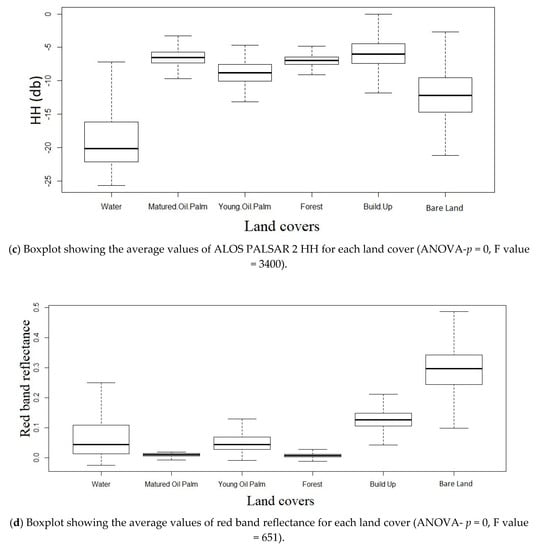 The HH, HV, HH-HV, and HH/HV images from the ALOS PALSAR, VH from Sentinel-, and red band from Landsat data were used to identify the backscattering (radar) and reflectance (optical) threshold values that can differentiate oil palm from other land covers/uses (Figure 2). This was done by studying the distributional characteristics and levels of the backscattering and reflectance values using box plots and analysis of variance (ANOVA) statistical test (Section 3.2) [22,45,49,50,51]. First, several ROIs (Figure 3 and Table 2) were extracted for each land cover (oil palm, forest, bare land, water, and built up areas) classes. Further we produced/plotted histograms for HH, HV, HH-HV, HH/HV, VH, and red band images using the ROIs to examine the range of backscattering and reflectance values that can represent different land covers in Peninsular Malaysia. This is rather a time consuming process that requires careful selection of pure pixels representing each land cover class in the study region. Finally, the mean and standard deviation values of each land cover class (based on the ROIs) were calculated using box plots (Figure 4). Thresholds that are specific to Peninsular Malaysia are better than the thresholds developed for oil palm areas worldwide [21] because oil palm in Peninsular Malaysia is planted in various soil surfaces (undulating) and soil types (peat and mineral soil) that may give different backscatter responses towards the satellite sensors compared to other regions.