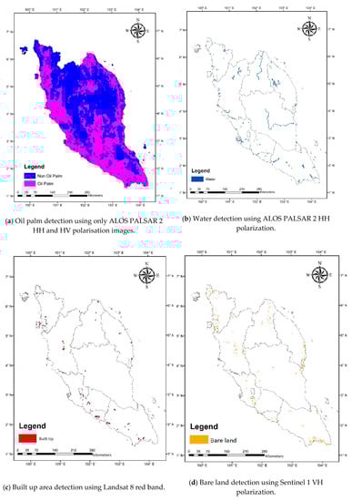 The analysis of the HH, HV, HH-HV, and HH/HV polarization images of ALOS PALSAR 2, VH polarization image of the Sentinel 1 and the red band of Landsat TM data show that different satellite images have the potential to discriminate oil palm from other land use types when they are synergized. The backscattering and reflectance threshold values from all the datasets used in this study are shown in Table 4. Backscattering values of more than 3.5 and 1.09 dB in HH-HV and HH/HV data, respectively, are useful to identify oil palm trees throughout Peninsular Malaysia. Nevertheless, some misclassification of oil palm trees that maybe caused by bare land, water surfaces, and built up areas can be minimized by adopting radar C-band (VH) and L-band (HH) backscattering threshold values of >0.012 and <−10 dB, respectively, and reflectance (red band) of > 0.045% (Table 4 and Figure 5). By removing unwanted land use/cover types, the area of oil palm detection was improved from 4.25 Million ha (Figure 5a) to 2.77 Million ha (Figure 5f).
