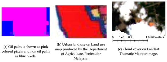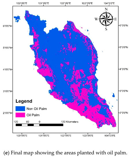 Moreover, some of the small holders’ plantations do not have an exact area calculation because they might have additional plantations on their own lands after registering with MPOB. Since in this study we used optical imagery to remove the built up areas, there may be a limitation of removal due to cloud cover. Figure 6 shows one of the locations (1°21′23.45″ N, 103°33′49.05″ E) where cloud cover from a Landsat 8 image (Figure 6c) caused misclassification (built up area was misclassified as oil palm, Figure 6a,b) and it was irremovable from the classified image. Therefore, this limitation may have also contributed to the overestimation of oil palm area.