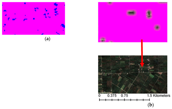 Misclassified coconut as oil palm: (a) Coconut land use (blue colored pixels) extracted from Land Use map overlaid on oil palm area classified in this study (pink); (b) Google Earth image showing coconuts.