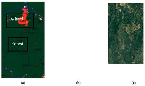 (a) Oil palm that was detected as forest by the Department of Agriculture; (b) oil palm that was correctly detected as oil palm in this study; (c) Google Earth image showing that the area is indeed oil palm.