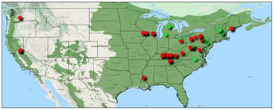 Locations of the training and test dataset samples in the United States. The green area represents a combination of the species distribution maps for Quercus spp. created by Little [15,16,17,18] and digitized by Thompson et al. [19].