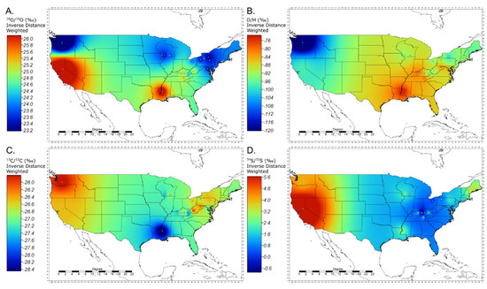 (A). Inverse distance weighting (power 2) of the 18O/16O isotope ratios of the 69 training dataset samples. (B). Inverse distance weighting (power 2) of the D/H isotope ratios of the 69 training dataset samples. (C). Inverse distance weighting (power 2) of the 13C/12C isotope ratios of the 69 training dataset samples. (D). Inverse distance weighting (power 2) of the 34S/32S isotope ratios of the 69 training dataset samples.