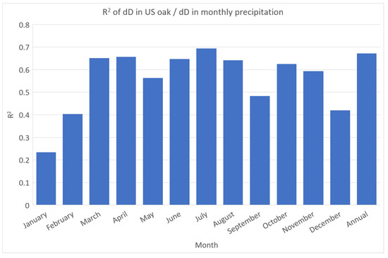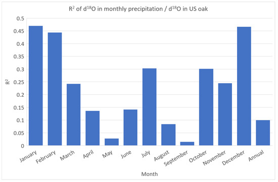 July appears to be an important month in the summer for US oaks, no other summer month shows quite the R2 as it. More information about the influence of each month may be garnered if isotope data from oaks around the world are added to the model. It should also be stated that no one month explained more than 50% of the variance in the oxygen isotope ratios in the 69 oaks; oxygen in cellulose/lignins originates from water and CO2. Therefore, there may yet be further improvements that can be made to models.