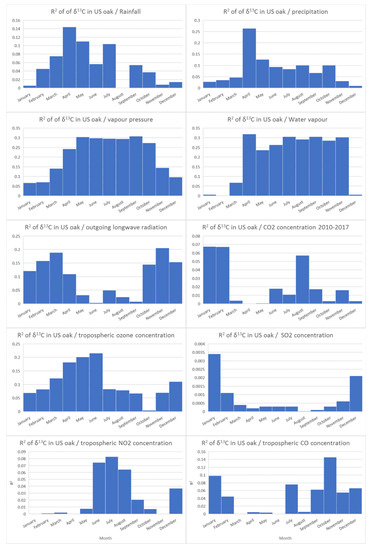 Pollutants such as Carbon Monoxide, CO2, and NO2, which have been stated to influence stomatal conductance [28,37,38] explain little of the variance in the carbon ratios of oak in this study. Tropospheric NO2 in the US, particularly Eastern USA is relatively high compared to most regions on the planet; in July 2017 the AURA Satellite measured 108 billion molecules/mm2 NO2 in New York [39,40]. Only China has typically greater NO2 concentration; in July 2017 the AURA satellite measured 178 billion molecules of NO2/mm2 [39]. Carbon monoxide has its greatest relationship with 13C/12C in oak in October (R2 = 0.146, Figure 6), a time of year when oaks are typically shedding their last leaves. Most likely, this is a coincidence or the relationship refers to a covariate as there is no clear logical causal explanation for this phenomenon. The strongest relationship between NO2 and carbon isotope ratios is in summer, particularly in July. In the context of the results from the oxygen and hydrogen isotope ratios, this may further suggest conditions in July are a key point in an oak’s calendar. To a degree, this appears to be consistent with the findings of Christison and Christison [41] that the growing months of leaf-shedding stress is confined to the months of June, July and August. This finding is also consistent with stomatal conductance experiments using pollutants [28], though it is noted that the relationship is not as strong as precipitation or vapour pressure which all have max R2 relationships over 0.25. Various studies have emphasised the importance of pressure and vapour pressure’s influence on carbon isotope ratios [42]. Some have shown that carbon ratios may be related to radiation, however, the body of knowledge shows that any relationship is likely indirect as radiation can influence air pressure and water vapour pressure [26]. Water vapour pressure is related to stomatal conductance [26], it is also noted that low water vapour pressure can cause water stress in plants and can be a rate limiting step in the growth of trees and may also fractionate carbon isotope ratios [43].