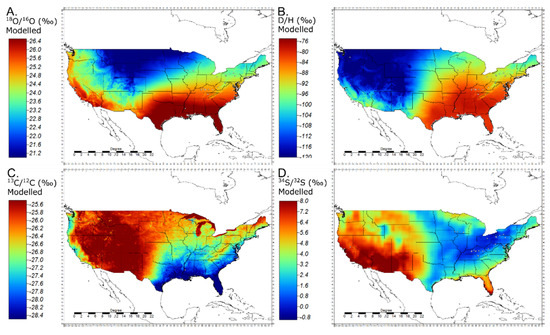 (A). Predicted map of US oak oxygen isotope ratios based on 18O/16O isotope ratios in January Precipitation (95% CI = +/−1.8‰). (B). Predicted map of US oak hydrogen isotope ratios based on D/H isotope ratios in July precipitation (95% CI = +/−13.28‰) (C). Predicted map of US oak carbon isotope ratios based on water vapour in April (95% CI = +/−1.4‰). (D). Predicted map of US oak sulfur isotope ratios based on Reflected Short Wave Radiation in March and sulfate in May (95% CI = +/−2.52‰).