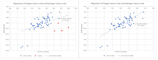 (Left) Regression of oxygen (18O/16O) and hydrogen (D/H) ratios in the 69 oak samples. Red points indicate outliers, all of which were sampled at the Eddy Arboretum, Institute of Forest Genetics. (Right) Regression of oxygen and hydrogen ratios (D/H in oak) in the 69 oak samples. Outliers from the Eddy Arboretum have been removed. The function for the regression line and R2 of the regression is included in both plots.