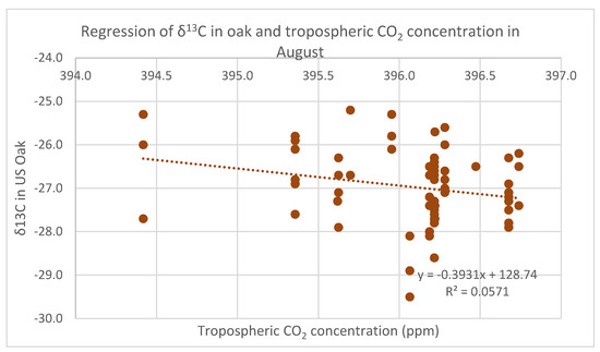Regression of δ13C in oak and tropospheric CO2 concentration in August.
