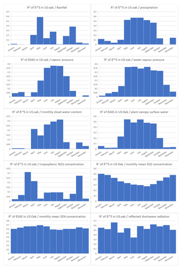 To date, prevailing theories about sulfur isotope ratios in timber and agricultural products are that they may be related to plant or microbial fractionations [44], atmospheric deposition under certain conditions [45,46], or proximity to the sea [32,34,47]. Often, sulfur isotope ratio analysis is used just to identify the source of sulfur in geochemistry [33]. NO2 concentration is related to pollution [48], March and November NO2 concentrations appear to have some relationship with sulfur isotope ratios with R2 of 0.3108 and 0.2724, respectively (Figure 11). This may suggest that atmospheric deposition has some influence on sulfur ratios, though the findings of Novak and Bottrell [46] must be noted; if sulfur has been in the soil for longer than sulfur from pollution (over 50 years) then the sulfur within the timber is predominantly natural. The seasonal patterns in R2 and sulfur isotope ratios for cloud water content, precipitation, vapour pressure and water vapour may suggest that rates of transpiration play a role in the sulfur isotope ratio of oak. All the aforementioned parameters are related to transpiration [43] and the fact that strong relationships between the parameters and sulfur ratios exist while the trees are in leaf is not likely a coincidence.