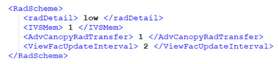 The controlling tags on the SIMX-File are in section RadScheme under AdvCanopyRadTransfer and ViewFacUpdateInterval (Figure 3). Both tags can be edited individually since the update of the ViewFacUpdateInterval also controls the update interval of the view factors analysis.