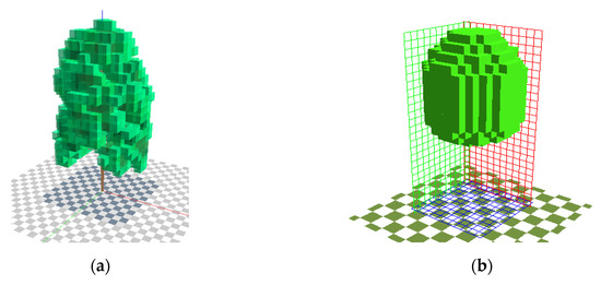 L-Tree with leaf area density (LAD) ranging from 0.025 to 0.825 m2/m3 (a); Parametric-Tree with homogenous LAD of 0.3 (b).