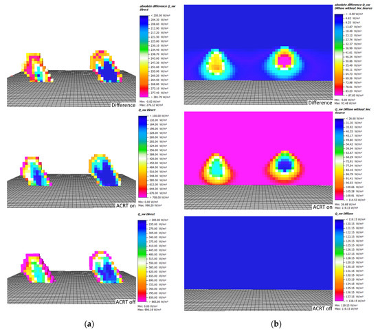 By looking at the differences in direct and diffuse shortwave radiation between the two simulations at noon, the total effect of the L-Trees and the ACRT module can be seen (Figure 6).