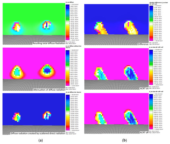 Difference and absolute direct (a) and diffuse shortwave radiation (b) at noon (sun position: 164.4° azimuthal and 58.3° height angle, view direction west), with and without the Advanced Canopy Radiation Transfer (ACRT) module for L-Tree (left) and Parametric-Tree (right).
