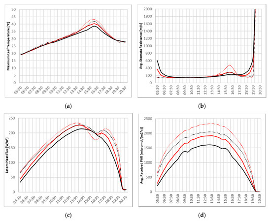 Graphs of various tree parameters: Maximum leaf temperature (a), average stomata resistance (b), latent heat flux (c), average received photosynthetic radiation (d). Red lines indicate L-Trees, black lines Parametric-Trees, dashed lines ACRT module off, solid lines ACRT on.