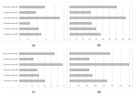Root mean square error between different combinations of Parametric-Tree, L-Tree, and ACRT on and ACRT off: Maximum leaf temperature (a), average stomata resistance (b), latent heat flux (c), and average received photosynthetic radiation (d).