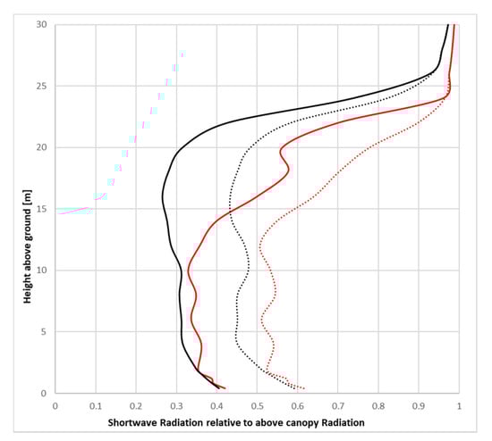 Vertical distribution of shortwave radiation through tree centerline at noon; red lines indicate L-Trees, black lines Parametric-Trees, dashed lines ACRT module off, solid lines ACRT on.