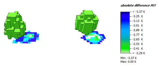 Absolute difference in physiological equivalent temperature (PET) at 1.4 m height level at noon below L-Tree (left) and Parametric-Trees (right) between ACRT on and ACRT off simulations. Negative values indicate lower PET values in the ACRT on simulation.