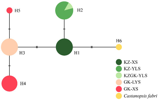 After alignment using C. fabri as outgroup, the total length of chloroplast sequences was 1158 bp, from which seven variable sites and six haplotypes were identified. The sequence variants and their positions are shown in Table 2. Within the lineage of C. sclerophylla/C. tibetana, five variable sites and five haplotypes were identified. Haplotypes H1 and H2 were detected in populations of C. sclerophylla, while haplotypes H3, H4, and H5 were found only in C. tibetana. Castanopsis × kuchugouzhui shared haplotype H2 with C. sclerophylla at the Yuelushan. Population GK-XS possessed two haplotypes H4 and H5, while the other populations were fixed for one unique haplotype. There was no shared common haplotype between C. sclerophylla and C. tibetana, nor between C. × kuchugouzhui and C. tibetana. Relationships among haplotypes are shown in Figure 1. Haplotype H2 was closely related to H1, and they diverged from haplotypes H3, H4, and H5, which constituted a haplogroup.