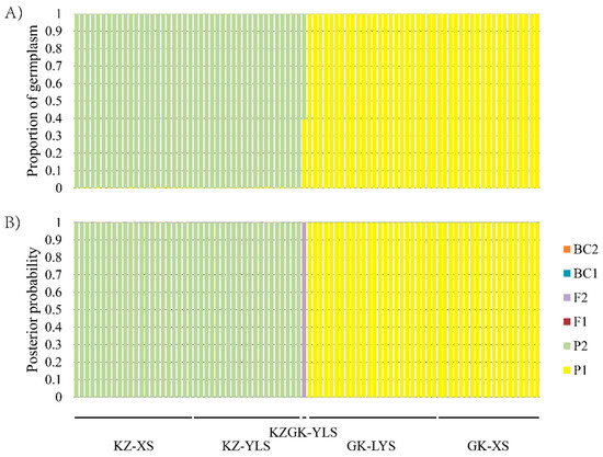 (A) Genetic admixture coefficient of the samples; (B) posterior probability of genotype category evaluated based on nuclear microsatellite markers. Population codes are the same as in Table 1.
