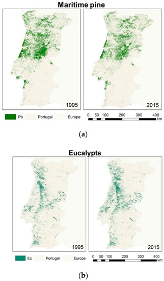 Moreover, according to the known land cover trend between these two species, the maritime pine forest has experienced a reduction between 1995 and 2015 which was mostly replaced by eucalypts new afforestation (Figure 6b).