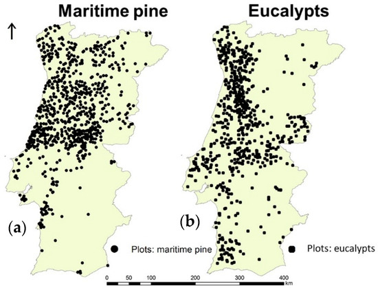 National Forest Inventory data (1990–1994): (a) Plots in pure maritime pine stands (n = 744); (b) Plots in pure eucalypts stands (n = 615).