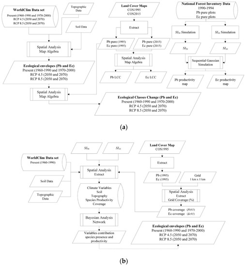 Workflow: (a) species ecological envelopes and ecological classes change maps, land cover change maps (Pb LCC and Ec LCC), and productivity maps (SI50 and SI10); (b) Bayesian network analysis for species presence (Pb95 and Ec95) and productivity (SI50 and SI10).