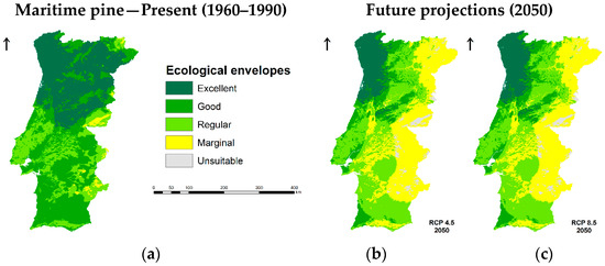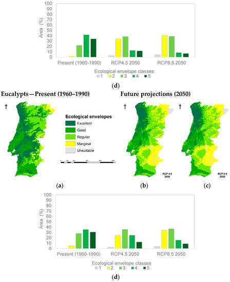 Ecological envelope maps projected for future scenarios in 2050 (Figure 5b—RCP4.5; Figure 5c—RCP8.5; Figure 5d), showed a decrease in the country’s area potentiality (excellent, good, and regular areas) for both species. Maritime pine potential area is expected to decrease to 63–54%, respectively, in the RCP4.5 scenario and the RCP8.5 scenario. However, for eucalypts the decrease will not be so severe, ranging to 73–62%, respectively, in each scenario.
