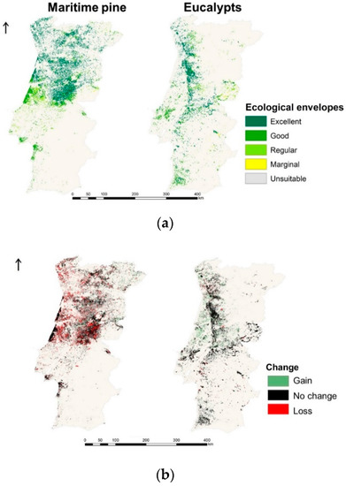 Comparing the ecological envelope classes (Figure 5a) over the present species distributions in 1995 (COS1995; Figure 1) it was verified that 99% of maritime pine forest and eucalypts forest were found inside excellent, good and regular ecological envelope classes (Figure 6a). In fact, 62% of the maritime pine forest is inside the excellent class (Figure 6a) compared to 52% of the eucalypts forest (Figure 6a).