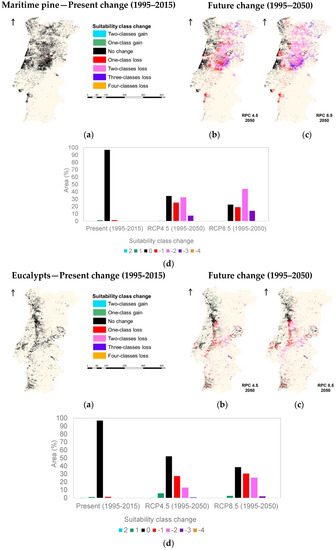 In 2050 future scenarios (Figure 5b,c), the maritime pine forest area (Figure 1a) will lose potentiality by decreasing from 99% to 84–72%, respectively, in each scenario (Figure 7b–d). Nevertheless, for the eucalypts forest area (Figure 1b) the potentiality loss will be lesser than for maritime pine, decreasing only to 91–85%, respectively, in each scenario (Figure 7b–d). Indeed, maritime pine forest in excellent areas class will experience a great loss in potentiality, from 62% to 19–11%, respectively, in each scenario (Figure 5b–d). Conversely, the eucalypts forest showed a much lesser decrease, from 52% to 32–22%, respectively, in each scenario (Figure 5b–d). The loss of maritime pine forest area potential is more severe in the north inland of the country (three-class dropdown) followed by the central north (two-class drop drown; Figure 7b–d). However, the loss of the eucalypts’ forest area potential will occur in the inland (three-class drop drown) followed by the center (two-class dropdown; Figure 7b–d).