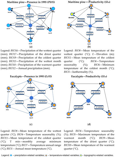 Bayesian networks have become extremely popular for gaining deep insight into manifold problem domains [60]. Their inherently graphical structure built upon machine learning algorithms based on the Bayesian Network formalism leads to robust models optimal for exploring and explaining complex problems. In this study, four supervised Bayesian networks machine-learned from the data (i.e., presence—Pb95 and Ec95 and productivity—SI50 and SI10) were created to assess the most influential variables conditioning maritime pine and eucalypts distribution and productivity. To measure the variable influence regarding the target node (X) of each network, first, the relative mutual information (RMI) was calculated to quantify the percentage of information gained on X by observing Y