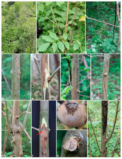 Main disease symptoms detected on European ash trees: extensive canopy dieback (a), shoot blight (b,c); branches with inner bark discolorations (d,e); active sunken cankers on branches with Diplodia fraxini pycnidia (arrow) (f–i); cross-section of branches showing wedge-shaped necrotic sectors (j,k); epicormics shoots below a branch canker (l).