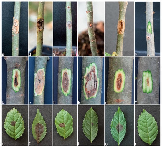 From top to bottom symptoms observed on seedlings, detached branches and leaves after inoculation with Diaporthe eres (a–c), Diplodia fraxini (d–f), Diplodia mutila (g–i), Diplodia subglobosa (j–l), Hymenoscyphus fraxineus (m–o). Controls (p–r).