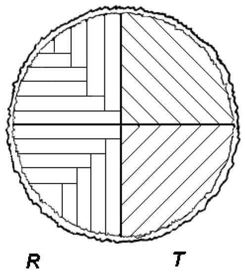 Beech wood (Fagus sylvatica L.) was used for the experimental measurements. The samples were chosen from two beech logs with a diameter of 40 cm and the length of 300 cm. The forest is located in the part called Môťová (475 m ASL) and it is a part of the University Forest Enterprise of the Technical University in Zvolen, Slovakia. The radial and tangential samples were cut out (longitudinal and cross section sawing) from the log, according to sawing patterns (Figure 1). Dimensions of drying samples were 120 × 800 × 30 mm (w × l × t). The samples were selected with sapwood without mature wood or false red heartwood. In total, 72 samples were investigated (36 radial and tangential samples, respectively).