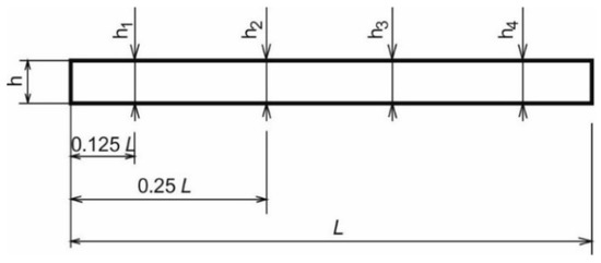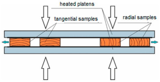 The process of contact-drying was conducted in hydraulic single storied press type CBJ 500–5 (TOS RAKOVNIK) at the Department of Wood Technology, Technical University in Zvolen, Slovakia (Figure 2). A temperature of the heating plates was 160 °C and three specific pressures of 1.0, 1.4 and 1.8 MPa were used. Drying with hydrothermal modification were combined in the process. It can be seen in the results obtained (the change in thickness, density and other parameters measured were used). The group of samples was dried until the temperature measured in the center of the sample reached the temperature of the pressing plate (tp + 5 °C) after being inserted between the heating plates and reaching the specific pressure of the plates. Contact-drying in the press was completed after reaching this temperature. One group of samples (radial and tangential) was made always from one log.
