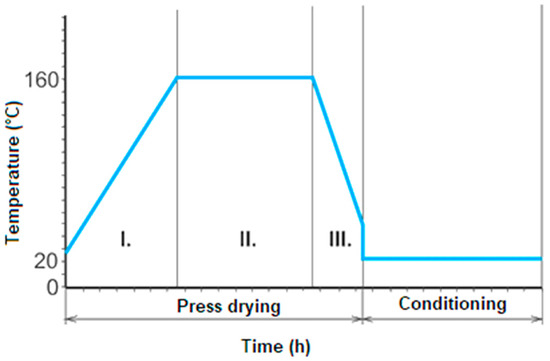 The drying modes are shown in Figure 3. The development of temperatures in the individual phase of contact-drying are shown there. The samples started to be dried when a constant temperature of 160 °C (I., II. phase) was reached. The cooling phase was (III.) after reaching the temperature in the center of the samples. Air conditioning at 20 °C was the last phase.