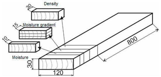 All of the samples were measured before and after drying with moisture gradient. The samples were separated into layers. The moisture content of each layer was determined by the oven-dry method. The moisture gradient was calculated using Equation (3):