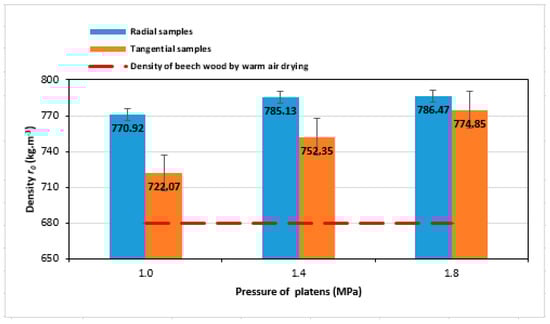 - An increase in density of the radial and tangential samples from 40 up to 100 kg·m−3 was discovered in comparison to the warm-air-drying. The density of the samples increased remarkably during contact-drying. The pressure of the heating plates had a substantial effect. The difference in the average density was more than 22 kg·m−3 between the pressure of 1.0 MPa and 1.8 MPa. The density values were significantly higher in the case of the radial than in the tangential samples after contact-drying. The maximum difference was measured at a pressure of 1.0 MPa, where the difference in average density was 48.85 kg·m−3.