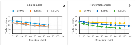 The change in thickness was observed in the case of all pressures compared to the thickness measured before drying. Figure 7 shows a decrease in the thickness from 3 (10%) up to 6 (20%) mm. The biggest changes of thickness of the radial and tangential samples were discovered in the case of the pressure of 1.8 MPa. According to the similar results [3,7,12] it is clear that the effect of contact-drying on changes in thickness are significant. Similar research studies [7,12] showed reduction of thickness of about 8 up to 20% after contact-drying process.