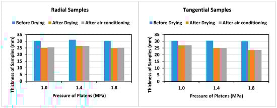 - The pressure of the heating plates affected the process and the resulting change in the thickness of the samples. The difference in the thickness change was larger in the case of the tangential samples. There was no change in the thickness of the samples after air conditioning.