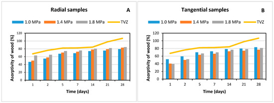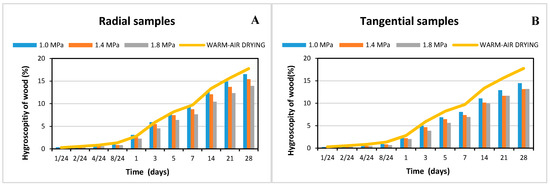 Development of wood hygroscopicity at time in the case of the (A) radial and (B) tangential samples.